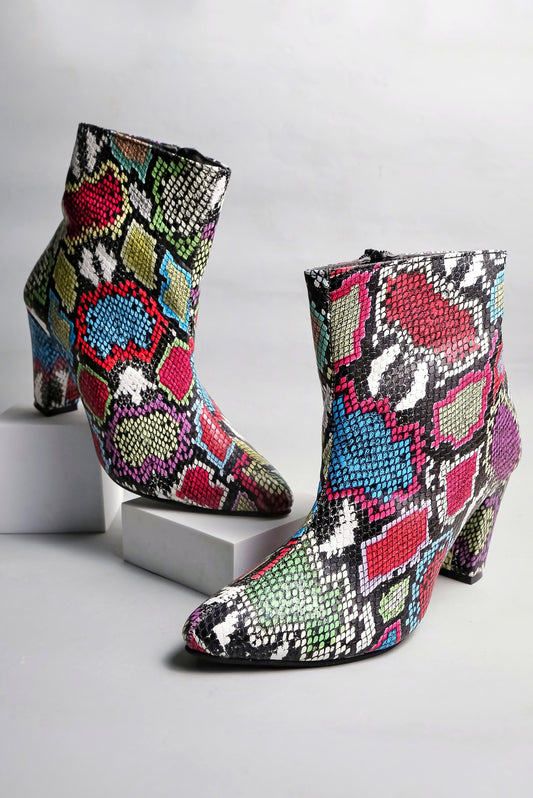 Women Multicolor Snake Print Pointed Toe Block Heeled Zip Up Boots