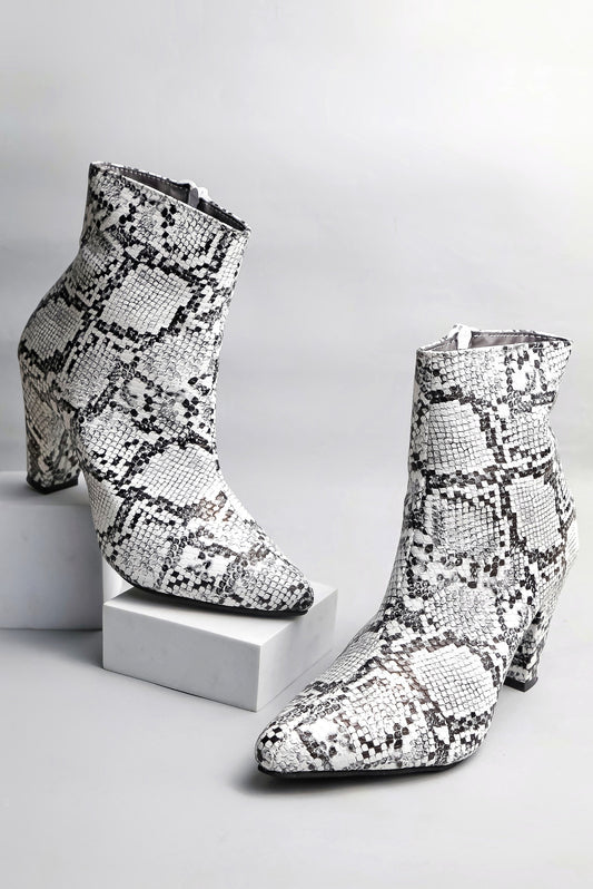 Women Black Snake Print Pointed Toe Block Heeled Zip Up Boots