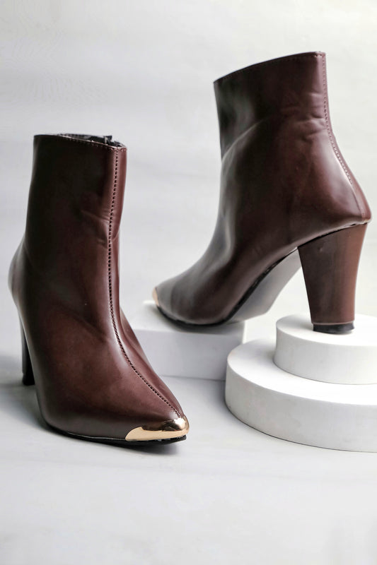 Women Brown Pointed Toe Block Heeled Zip-Up Boots