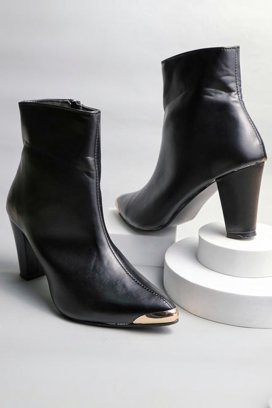 Women Black Pointed Toe Block Heeled Zip Up Boots